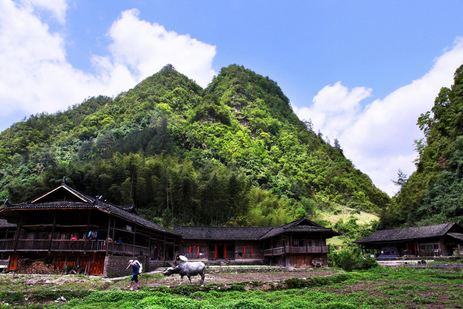 現(xiàn)有民居 4 棟,9 戶,40 余人,主要姓氏為羅姓、任姓、陳姓,主體民族為土家族。瓦房寨首富戶主羅時熙,這里因他蓋起了當(dāng)時當(dāng)?shù)刈詈廊A的大青瓦房而得名。原民居為長 5 間四合院,有單獨的馬房和寬敞的壩子,另有外朝門,朝門上有牌匾。瓦房寨羅家院落后因為被火燒而衰落。現(xiàn)多為近代由兩岸高山遷下來的苗民和土家族居民。這里如今是土家族山地農(nóng)耕生活展示體驗區(qū)。可以讓旅游客見證農(nóng)耕勞作等過程,觀看薅草鑼鼓等民俗表演,甚至可以體驗駕牛犁田、薅草插秧、下水摸魚等鄉(xiāng)間生產(chǎn)生活,感受濃郁的鄉(xiāng)村生活氣息。