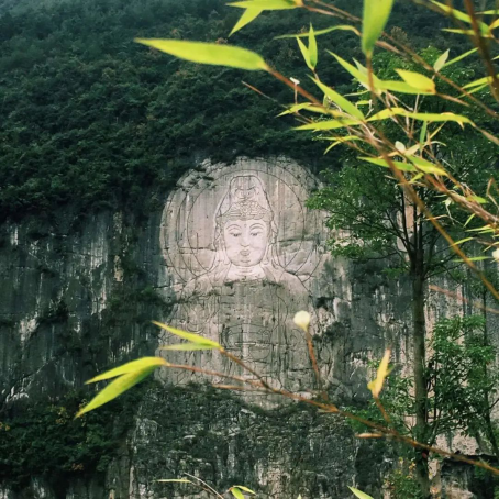 景區(qū)內(nèi)坐落著一座巨大的觀音摩崖像,這尊觀音像像高123米,寬69米,是目前世界最高的觀音雕像。觀音手執(zhí)凈瓶柳枝,端坐蓮臺(tái),指灑圣水,面目和祥。傳聞對(duì)著觀音像虔誠(chéng)的許下心愿,就能實(shí)現(xiàn)。